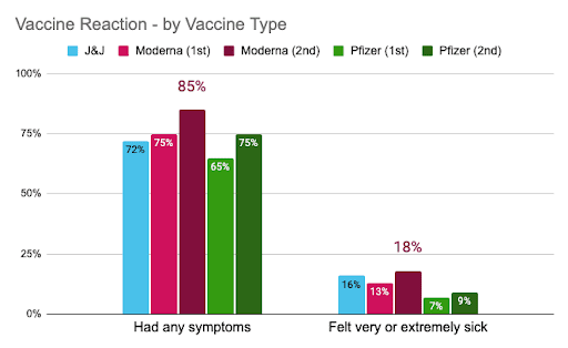For all vaccine types, fatigue, pain at the injection site, and muscle/body aches were the most commonly reported symptoms. Yet, for every symptom (except nausea), a larger portion of Moderna’s second dose recipients reported experiencing that symptom, compared to recipients of other vaccines.