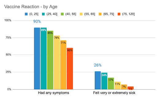 Similar trends were observed for younger individuals when compared to older folks. Those 40 years of age and younger experienced between 2 and 3 whole-body symptoms on average, and nearly a quarter felt very or extremely sick. By contrast, those at least 75 years old experienced between 0 and 1 whole-body symptoms on average, and only 4% felt very ill.