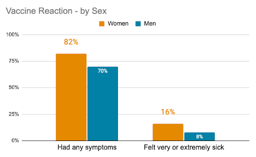 Women were more likely to have any symptoms, have more whole body (systemic) symptoms, and generally feel sicker following their vaccination, compared to men.